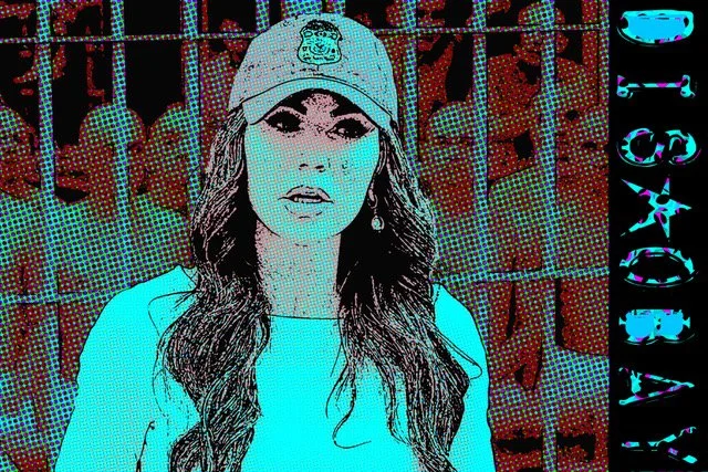 This artwork from the DISOBAY series delivers a sharp and unsettling vision of authority and confinement. A woman wearing a cap with an official insignia stands in stark focus, her presence contrasted by rows of faceless, imprisoned figures behind bars. Rendered in halftone pop-art textures and drenched in neon cyan, magenta, and deep red, the scene takes on a surreal, almost comic-book intensity. The interplay of bold color and rigid structure amplifies the themes of surveillance, dehumanization, and systemic control. The vertical DISOBAY branding demands resistance, urging viewers to question obedience in the face of oppression.