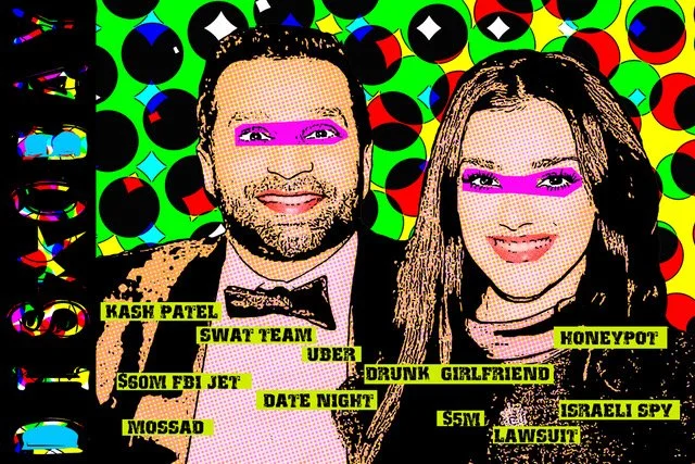 A bold, psychedelic pop-art collage featuring the U.S. FBI Director Kash Patel and girlfriend Alexis Wilkins rendered in high-contrast comic-book halftone dots. Both have bright pink bars over their eyes, giving an anonymous, masked appearance. The background is filled with vibrant, repeating circular patterns in neon green, yellow, red, blue, and black. The left side features vertically distorted, colorful text reading “DIS★OBAY.” Scattered across the artwork are yellow blocks of text with black stencil lettering containing provocative phrases such as “KASH PATEL,” “SWAT TEAM,” “$50M FBI JET,” “MOSSAD,” “UBER,” “DRUNK GIRLFRIEND,” “DATE NIGHT,” “HONEYPOT,” “$5M,” “ISRAELI SPY,” and “LAWSUIT.” The overall aesthetic blends satire, political pop-culture references, and comic-style illustration.